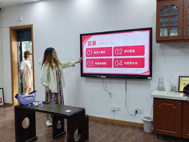 本次课程教学内容为交流音乐。活动伊始,小老师带领同学们分组进行破冰小游戏。在音乐声中了解彼此。在破冰之后,便进入了令人期待的音乐盲盒比拼环节。同学们怀着既兴奋又紧张的心情,参与到音乐卧底、猜歌名、歌曲填词等丰富多彩的游戏当中。尽管一开始大家都彼此陌生,略显局促,但随着游戏进行,大家逐渐放开,沉浸在音乐与游戏的世界中。随着课程的推进,同学们迎来了小组惩罚环节。他们根据游戏规则,进行了一段简单却不失精彩的表演。最后,大家齐聚一堂,进行合影留念。