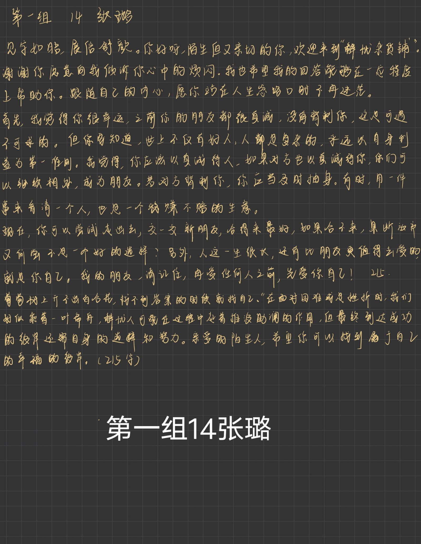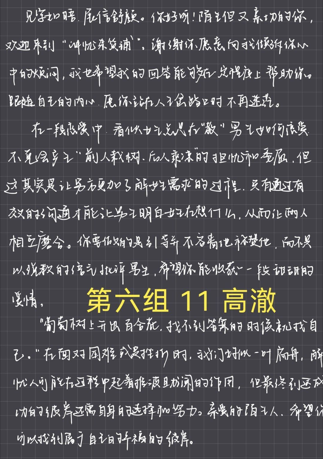 本次活动的内容是用解忧书信的形式解答同学们的疑惑。首先,工作人员对报名成功的同学进行分组,参与的成员将自己在日常生活中所产生的疑惑发送到相应的邮箱中,疑惑的内容可以是个人生活上的困难、学习上的挫折、爱情、友情……其次,工作人员将这些疑惑整合好并分发给其他参与活动的同学,由其他的同学为他人的疑惑进行解答。最后,将自己所书写的书信截图上传至群相册,让迷茫的同学从中汲取一丝力量,一起体会文字的魅力。