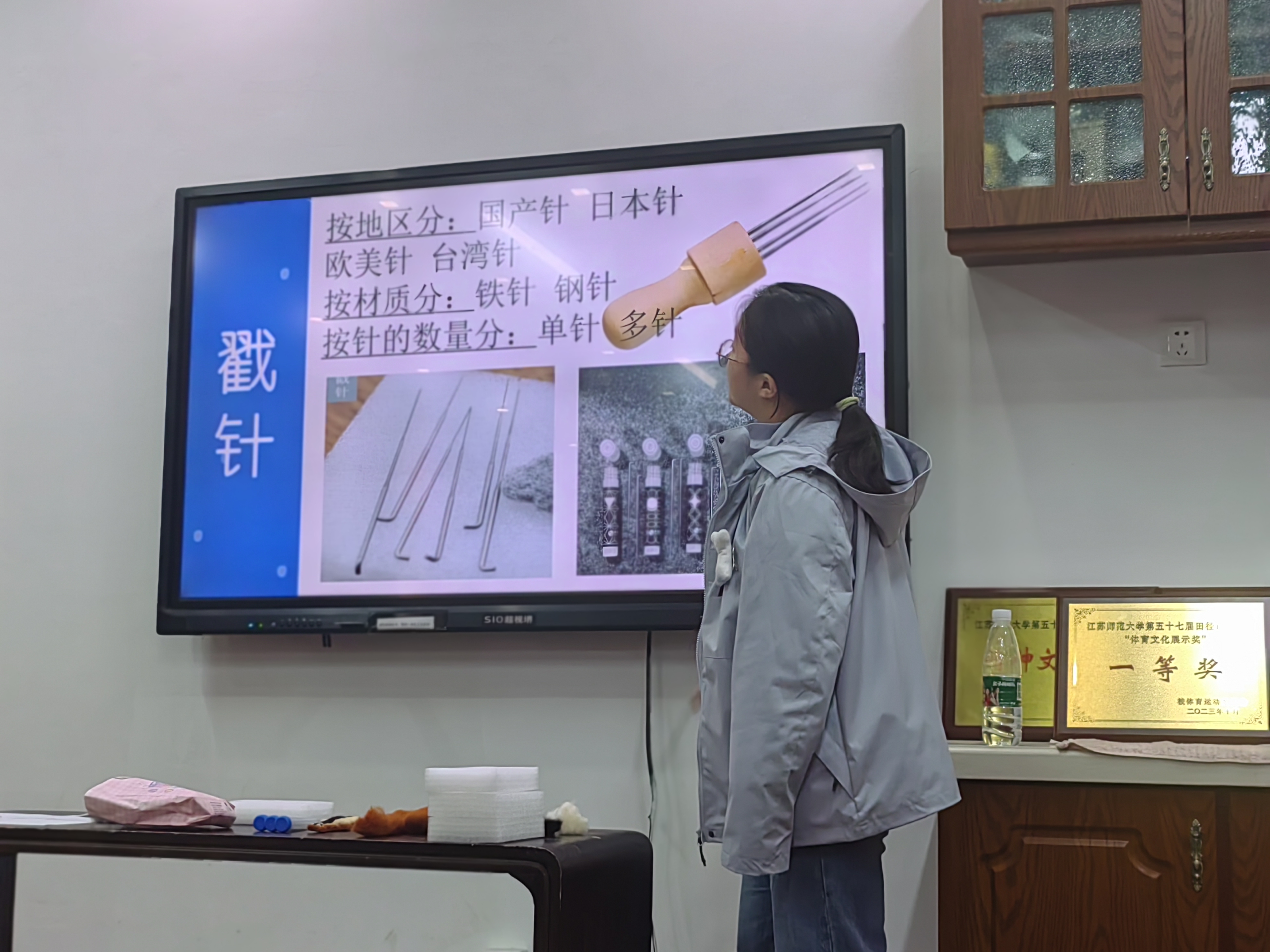 本次课程教学内容为认识羊毛毡以及学会制作乐器标本。主讲老师曹佳怡首先带领同学们学习PPT的内容,介绍了羊毛毡的基础知识,如羊毛毡的历史起源、戳针的类型、羊毛的材质和工作台成列的用具等,借助形象具体的图片来丰富同学们对于羊毛毡以及相关制作工具的认识。接着,小老师就本次课程的重点——羊毛毡制作手法进行了详细讲解,同学们听完后对制作乐器标本环节充满了好奇和期待。最后,在小老师和助教的安排指导下,大家迫不及待地开始尝试运用刚刚所学的手法,进行手工制作。同学们都非常的认真仔细,制作完后还现场展示了一下自己的作品,温馨欢乐的气氛充盈了整个教室。活动结束后,大家合影留念。