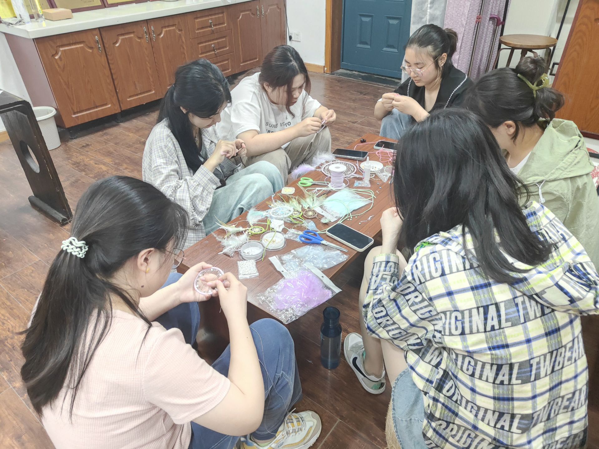 捕梦网,作为一种源自北美原住民的手工艺品,不仅蕴含着深厚的文化内涵,更是一种寓意深远的民间艺术品。它象征着守护和梦想,被认为能够捕捉美好的梦境,阻挡恶梦的侵扰。课程伊始,小老师贠樱柯侃侃而谈,向同学们介绍捕梦网的历史,仔细认真地带领同学们了解制作捕梦网需要的材料。接着,同学们通过对本次课程主角——捕梦网制作过程的详细学习,对自己的动手能力充满了信心。最后,在小老师和助教的安排指导下,大家迫不及待地开始分组制作梦幻的捕梦网。活动现场,同学们热情高涨,聚精会神地挑选材料,用彩色的线绳、珠子和羽毛,精心编织,仔细地穿梭线绳,一针一线地将梦想编织成真。羽毛轻轻地摇动着,仿佛已经能看到那些美丽的梦境在捕梦网上翩翩起舞。有的学生还巧妙地将自己的名字或者喜欢的图案融入到捕梦网中,使作品更加个性化。活动结束后,大家带着自己的作品,在学堂门口合影留念。