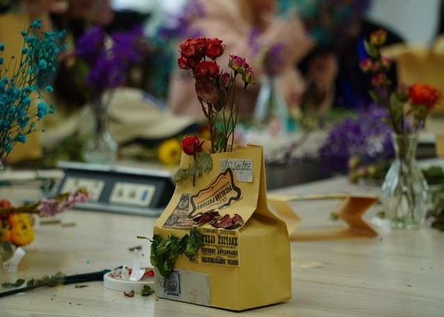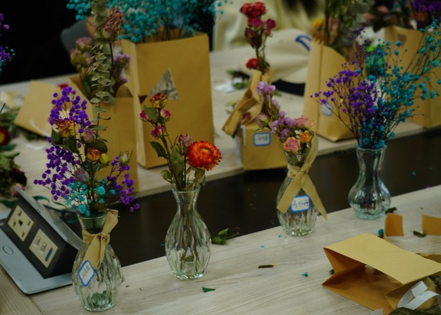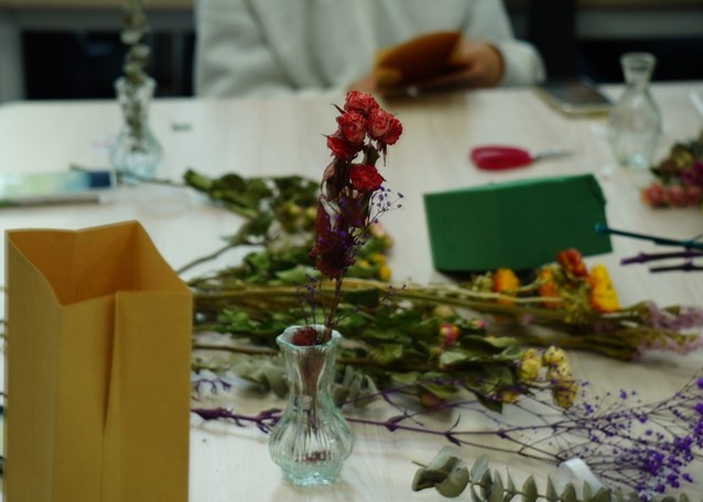 本次课程以插花为主要制作对象。邀请同学们欢聚一堂,亲手制作纸袋插花和玻璃瓶插花,使大家既感受到制作插花的快乐,也体会到色彩与设计的魅力,发现美,创造美。