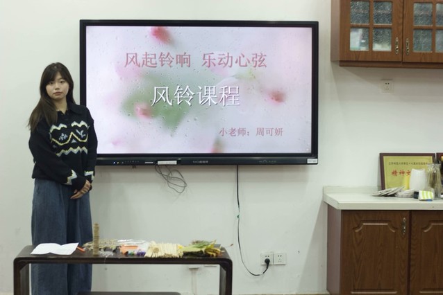 本次活动教学内容为风铃制作。小老师周可妍首先带领同学们学习PPT的内容,介绍了风铃的古老起源与美好寓意,借助形象的图片和生动的视频让同学们初步熟悉了风铃的制作。通过逐步演示,详细讲解风铃的制作,同学们掌握技巧的同时深刻感受到传统文化的魅力。最后,在小老师和助教的安排指导下,大家迫不及待地开始分组制作精美的风铃。热心互助,精心装饰,时光缓缓流淌,佳作渐渐成型。轻轻晃动,是风声悠扬,亦是心声的回响,学堂萦绕着淡淡的恬静与美好。活动尾声,小老师简要总结课程,邀请大家合影留念。